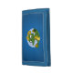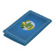 TriFold Nylon Wallet with illustration of head of a cute little green dragon in blue circle on blue background, cute fantasy / fairy-tale design for kids by Maxi Harmony,
