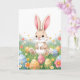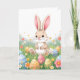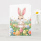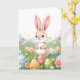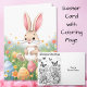 Personalized cartoon Easter bunny Easter card with an inside coloring page. Cute bunny sitting in grass full of pink and blue flowers and Easter Eggs.