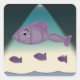A large purple cartoon fish swimming in blue waters above her little purple fish. The spot light is highlighting these special ocean life on this sticker.