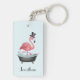 Elevate your accessory game with this whimsical and elegant flamingo keychain. This piece features a charming flamingo wearing a monocle, enjoying a playful splash in the bath, which is sure to bring a smile to your face.