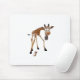 Cute cartoon giraffe looking down at a mouse with a curious look on it's face.