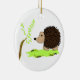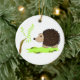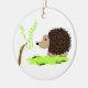 A cute faced cartoon hedgehog on a patch of green grass with tree branch of leaves in front of him.