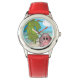 Cartoon color illustration of a hippo with palm trees and turquoise water, blue sky with white clouds.