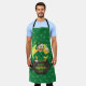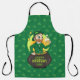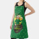 Apron with an Illustration of a smiling leprechaun wearing a green suit, a bow-tie, and a bowler hat while sitting inside a pot o’ gold and holding a pint of beer, with yellow, green, and orange rainbow in the background. The image is placed over a seamless dark green background with shamrocks.
