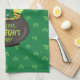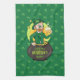 Kitchen Towel with an Illustration of a smiling leprechaun wearing a green suit, a bow-tie, and a bowler hat while sitting inside a pot o’ gold and holding a pint of beer, with yellow, green, and orange rainbow in the background. The image is placed over a seamless dark green background with shamrocks.
