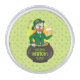 Lapel Pin with an Illustration of a smiling leprechaun wearing a green suit, a bow-tie, and a bowler hat while sitting inside a pot o’ gold and holding a pint of beer, with yellow, green, and orange rainbow in the background. The image is placed over a seamless light green background with shamrocks.