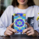This funky mandala flower design features blue, yellow, and pink in a cartoon style. Trippy geometric visuals for the modern hippie or lover of vibrant colors!