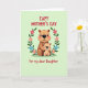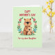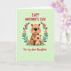 This card features two round-eared cartoon rodents at the center, with a larger warm-brown one wrapping its arms around a smaller, lighter tan companion as they share rosy cheeks and wide smiles that feel like a quiet, affectionate moment ❤️. Their heads tilt slightly toward each other, giving the hug a protective, close-knit look that reads like family or best-friend closeness. A circular wreath frames them, made of leafy green sprigs with small, stylized flowers tucked throughout. The blossoms alternate soft pink and sky blue petals, each with a bright yellow center that adds a gentle pop of color 🌼. The background is a pale pastel green, keeping the scene calm and airy while letting the characters stand out. Red text in a rounded font sits above the wreath and again below it, balanced to frame the illustration without covering the figures. The larger rodent’s arms curve around the smaller one inside the leafy ring, with the flowers spaced evenly around the circle.