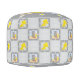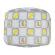 A gray and yellow pouf for a nursery room or for a child's room with the illustration of a cartoon gray mouse eating some yummy Swiss cheese , as well as some pretty edelweiss flowers . Personalize it with a name if you wish . Make sure to choose the type of fabric you want before check out .