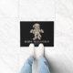This Halloween theme doormat features Destei's original cartoon illustration of a creepy mummy character on a black background color. Under the image it reads "Happy Halloween!" together with a personalizable text area for a family name, for example.