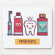 This oral care related design features a cute cartoon of a toothbrush, toothpaste, a smiling tooth and a bottle of mouthwash.