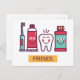 This oral care related design features a cute cartoon of a toothbrush, toothpaste, a smiling tooth and a bottle of mouthwash.