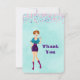 A thank you card with a cartoon illustration of a party girl holding a cocktail. Pink confetti sprinkled along the top,. Message on the back which you can customize or remove or leave as is. Set on a mint green watercolor background.