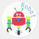 Birthday party favor sticker with colorful cartoon graphics of a red, green, yellow, and blue robot. Dotted blue text reads Robot and can be personalized. Matching party supplies are available.