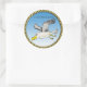 Cartoon seagull flying over head with a gold frame classic round sticker