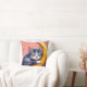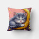 Cartoon sleeping kitten curled on a crescent moon throw pillow