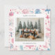 Holiday card featuring cute Christmas tree, ornament and foliage illustrations in a pastel color scheme with one family photo paired with a holiday greeting and your name and year in a sans serif font.