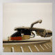 A 12-inch LP being played. The stylus is in contact with the surface by wikipedia: A phonographic record (also known as a gramophone record, especially in British English), often simply recorded, is a storage medium for analog sound in the form of a flat disc with an inscribed modulated spiral groove. The groove usually starts near the periphery and ends near the center of the disk. Initially, the discs were commonly made of shellac; starting in the 1940s, polyvinyl chloride became common. Since