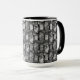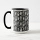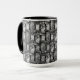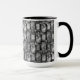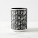 Image of overlapping and spaced rectangles, can resemble dark metal plates that have been 'beaten' and this has caused them several small dents or notches.