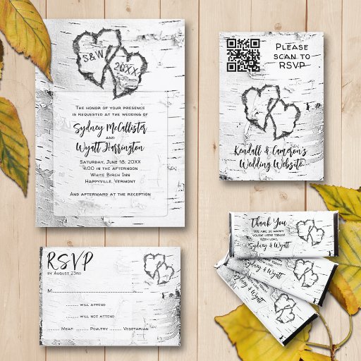 Birch bark wedding website / details enclosure cards. Customize text in three places and direct guests to an online location to reply, see photos, and get wedding information. Rustic tree bark design with two carved hearts at the top. Reverse also has tree bark design.