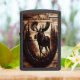 A detailed carving of a moose standing in a forest, set against a wooden background. Put you name or a loved one's name