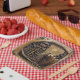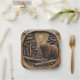 Rustic carved wood look paper plates with a Bear standing in a pine tree forest under a full moon.