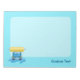 Smiling blue cartoon car washing under carwash brush. Custom background color. Custom text.
