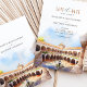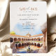 Announce your upcoming wedding with this "Save the Date" card, featuring a stunning watercolor illustration of Casa de Pilatos in Seville, Spain. The design captures the essence of Spanish elegance with an intricate courtyard view, framed by sunlit arches and classic Andalusian architecture in soft shades of terracotta, ivory, and sky blue. Ideal for a romantic destination wedding in Seville, this card reflects the charm and sophistication of southern Spain. Perfect for setting the tone for a celebration steeped in history and beauty.