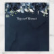 Sumptuous navy blue peonies cascading amongst dusty silver blue greenery against a dark navy watercolour background with a white fancy font swash calligraphy announcing your wedding.