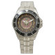 Has heft and feel of expensive stainless steel quartz watches. Good band with safety catch. I removed links, which is easy because engraved arrows show direction to push the linking pins. As always by this seller, the image (a railroad logo) is a perfect reproduction of my emailed image, and is precisely spaced and aligned.