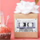 The "Cassette Tape" design features a typical vintage music cassette tape, with a transparent case and colorful stickers and writing, It also has customizable text which you can personalize.