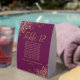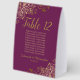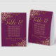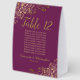 These elegant cassis purple or magenta and gold table tent signs will make it easy for your guests to find their seats, and also make your wedding reception more beautiful. The feature a simple design with a lacy script calligraphy title with the table number and space for the names of 10 guests. Below is space for the names of the couple and the wedding date. The corners are decorated with lacy floral curls and swirls. Great way to add a touch of formal class to your reception.