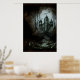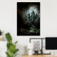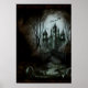 Dark colored Fantasy art of a large castle in dark forest. This is a AI generated art.