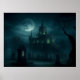Poster of the gothic residence of a villainous necromancer. Every night of a full Moon the evil thaumaturgist conducts his vile experiments animating the dead from the tombs that surround his castle. Nefarious green lights can be seen from the outside every time the necromancer pulls a lever in his laboratory, just the same moment when dead-men groans are heard long and deep in the foggy night... It was made with Leonardo.ai and modified by me.