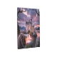 A dramatic image of a fairytale castle perched on a rocky cliff overlooking a waterfall at sunset. The castle features Gothic architecture with multiple spires, turrets, and ornate windows illuminated from within by warm yellow light. A grand stone bridge with railings leads to the castle entrance. The waterfall cascades into a dark lake below, with orange and purple light reflections creating a magical glow on the water.
