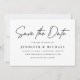 Simple save the date card featuring "Save the Date" in a black handwritten script with a white background. Personalize the modern save the date card by adding your names, wedding date, wedding location, wedding website, etc. The minimalist save the date card reverses to display your favorite horizontal engagement photo.