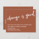 This suite's distinction is due to the modern, handwritten script font used for accent phrases. In this piece, the hand-lettered script font was used to create graphics depicting the words "change is good" on the front, and "stay in touch" on the back. The "cinnamon stick" background can be changed to any color you prefer. Please reach out with any special requests or for customizing assistance. // 100 //