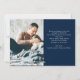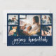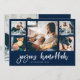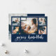 This simple, dark navy blue and white family holiday greeting card features modern, casual script typography that says "Joyous Hanukkah", with a multi photo grid of five photos on the front and one more on the back.