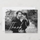 Simple wedding thank you card featuring your horizontal photo with "Thank You" displayed in a white handwritten script. Personalize the front of the modern thank you card by adding your name. The back of the photo thank you card displays your custom thank you message in white lettering with a sage green background. Designed to coordinate with our Casual Script Wedding Collection.