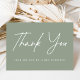 Simple wedding thank you card featuring "Thank You" displayed in a white handwritten script with a sage green background. Personalize the front of the modern thank you card by adding your name. Add your custom message to the back.