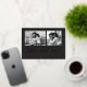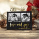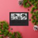 This simple classic charcoal black family holiday photo card features modern, casual gold foil script typography that says "love and joy", with a two photo grid on the front for a stylish, modern and minimalist holiday design.