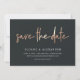 A modern save the date card designed for upscale couples or city weddings. "Save the date" appears in faux copper foil casual handwritten lettering. Personalize with your names, wedding date and wedding location beneath in white lettering on a soft black background.