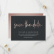 A modern save the date card designed for upscale couples or city weddings. "Save the date" appears in faux rose gold foil casual handwritten lettering. Personalize with your names, wedding date and wedding location beneath in white lettering on a soft black background.