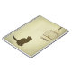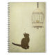 The silhouette of a kitty looking up at a birdcage. A soft antique wallpaper background