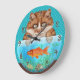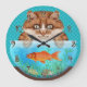 The original drawing on this eye-catching clock shows a mischievous orange-brown tabby cat grinning and staring - with wide, hungry eyes - down at a goldfish in its bowl. The naughty kitty has its paws inside the aquarium while the bright orange fish stares up at it. This unique novelty clock has a folk art / slightly dark Gothic look to it with a streak of devious humor. It's perfect for anyone who loves cats and fish.