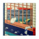 A cat sitting on the sill of a window where the sliding panels have been opened. It watches the Torinomachi Festival procession in the rice paddies nearby. A flock of birds fly over Mount Fuji in the background. A page of the series, Meisho Edo Hyakkei (100 Famous Views of Edo). From an original 19th century (1857) woodcut, Asakusa Tanbo Torinomachi Mode (Asakusa Ricefields and Torinomachi Festival), by Ando Hiroshige. All Rights Reserved © 2013 padre art