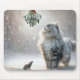A fluffy cat and a tiny mouse gaze at a bunch of mistletoe adorned with a red bow as snowflakes gently fall around them