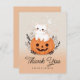 Express your gratitude with this Halloween baby shower thank you card, featuring a charming illustration of a cat sitting on a pumpkin, surrounded by foliage. The background showcases soft light orange and beige tones, creating a warm, festive look perfect for a fall-themed baby shower. All text is fully customizable, allowing you to personalize your message for your guests. This Halloween-themed thank you card is a delightful way to share appreciation with a playful, seasonal touch.