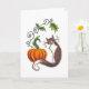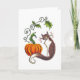 Vintage-style fall illustration of an elegant cat posed next to a cheery pumpkin. Curly stems and bright green leaves arc over the cat in a charming design. Great for fall and Halloween greetings!