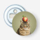 Funny cat with an apple balancing on top of his head.
